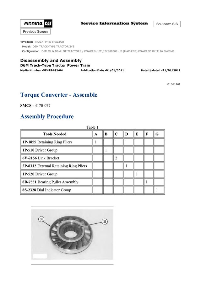 TRACTOR 2YS Configuration: D6M XL & D6M LGP TRACTORS / POWERSHIFT / 2YS00001-UP (MACHINE) POWERED BY 3116 ENGINE Disassembly and Assembly D6M Track-Type Tractor Power Train Media Number -SENR9482-04 Publication Date -01/01/2011 Date Updated -31/01/2011 i00963549 Transmission Brake - Remove SMCS - 4170-077 Removal Procedure NOTICE Care must be taken to ensure that fluids are contained during performance of inspection, maintenance, testing, adjusting and repair of the machine. Be prepared to collect the fluid with suitable containers before opening any compartment or disassembling any component containing fluids. Refer to Special Publication, NENG2500, "Caterpillar Tools and Shop Products Guide", for tools and supplies suitable to collect and contain fluids in Caterpillar machines. Dispose of all fluids according to local regulations and mandates. Note: Cleanliness is an important factor. Before the disassembly procedure, the exterior of the component should be thoroughly cleaned. This will help to prevent dirt from entering the internal mechanism. 1. Drain the oil from the transmission and bevel gear case.