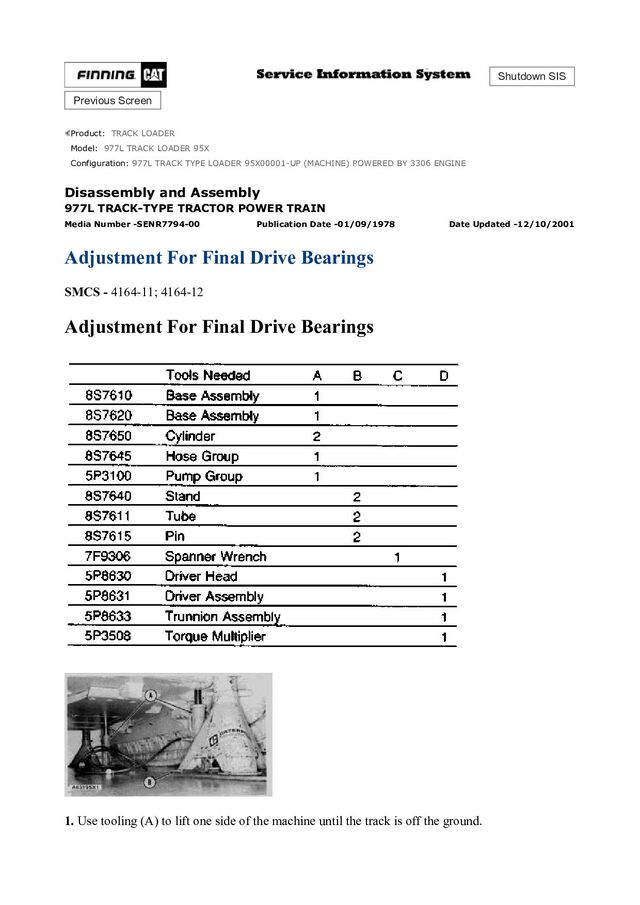 shaft. Use a hammer to push sprocket shaft (1) until the spanner nut can be installed on the threads. 4. Install tooling (B) on the sprocket shaft as shown. Fasten a hoist to the tooling. Install the sprocket shaft with tooling (B) with a force of 20 to 30 tons (180 to 265 kN). 5. Tighten the spanner nut with tool (C) while the pressure is still on the sprocket shaft. Tighten the nut to a torque of 700 ± 50 lb.ft. (950 ± 70 N·m). 6. After the spanner nut is tightened, release the pressure on the sprocket shaft and remove tooling (B). 7. Install holder assembly (2), the shims, washer assembly and nut on the sprocket shaft. Tighten the nut to a torque of 600 to 700 lb.ft. (810 to 950 N·m). 8. Measure the distance from the face of the holder assembly to the steering clutch case. Distance "X" must be 11.995 ± .062 in. (304.7 ± 1.57 mm) for a standard size sprocket shaft and 14.995 ± .062 in. (380.9 ± 1.57 mm) for a Low Ground Pressure sprocket shaft. 9. To fasten nut (3) in position make a .368 in. (9.35 mm) hole in one of the grooves in nut (3). Drill the hole through the nut and .75 in. (19.1 mm) deep in the sprocket shaft. Install pin (5) and ring (4). end by: