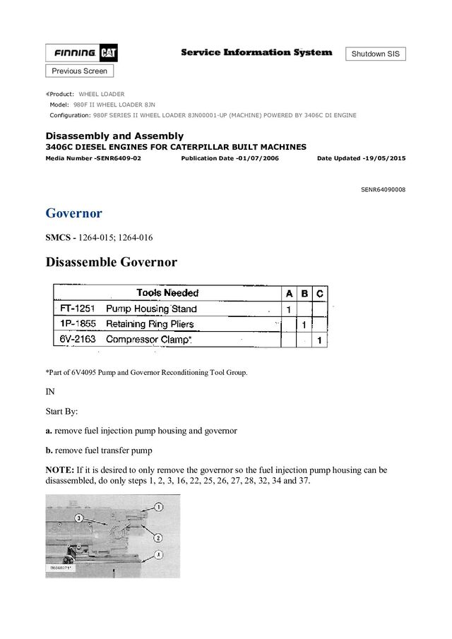 WHEEL LOADER 8JN Configuration: 980F SERIES II WHEEL LOADER 8JN00001-UP (MACHINE) POWERED BY 3406C DI ENGINE Disassembly and Assembly 3406C DIESEL ENGINES FOR CATERPILLAR BUILT MACHINES Media Number -SENR6409-02 Publication Date -01/07/2006 Date Updated -19/05/2015 SENR64090008 Governor SMCS - 1264-015; 1264-016 Disassemble Governor *Part of 6V4095 Pump and Governor Reconditioning Tool Group. IN Start By: a. remove fuel injection pump housing and governor b. remove fuel transfer pump NOTE: If it is desired to only remove the governor so the fuel injection pump housing can be disassembled, do only steps 1, 2, 3, 16, 22, 25, 26, 27, 28, 32, 34 and 37.