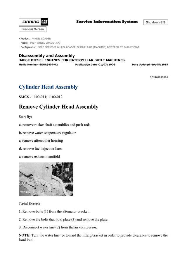 Special Instructions, SMHS7295. 5. Heat connecting rod (4) in an oven to a temperature of 177° to 260°C (350° to 500° F). Never use a direct flame to heat a connecting rod. 6. Put connecting rod (4) in position on the base plate of Tool (C). Put a new rod pin bearing (6) on the adapter part of Tool (C). NOTE: The old bearing is pushed out by Tool (C) as the new bearing is installed. 7. Use Tool (C) to push the new bearing into the connecting rod until the push adapter of Tool (C) makes full contact with the connecting rod surface. 8. Use a pin boring machine to make the rod pin bearing the correct size. The bore in the new rod pin bearing must be 50.830 ± 0.008 mm (2.0012 ± .0003 in). 9. Check the clearance between the ends of the piston rings. See the topic, "Pistons & Rings" in Specifications Manual, SENR6470. 10. Install the oil ring spring in the oil ring groove of the piston. NOTE: The oil ring is to be installed over the spring with the oil ring end gap 180° from the oil ring spring joint. 11. Install the oil ring on the piston with tool (B). 12. Install the second (intermediate) piston ring with the side that has the identification "UP-2" toward the top of the piston. Use Tool (B) to install the ring. 13. Install the first (top) piston ring with the side that has the identification "UP-1" toward the top of the piston. Use Tool (B) to install the ring. NOTE: After the installation of all three piston rings, put the piston rings in position so the end gaps are 120 degrees apart. 14. Put the piston in position on connecting rod (4). Put clean engine oil on pin (2), and install the pin. Install retainer rings (1) with Tool (A). Make sure the retainer rings are in the grooves of the piston. 15. Install bearings (3) in the connecting rod and connecting rod cap.