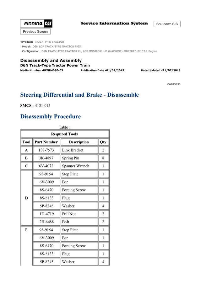 1 F 138-7575 Link Bracket 3 G 8B-7550 Leg 2 8B-7559 Adapter 2 3H-0465 Plate 4 1P-0498 Plate 1 1B-4207 Full Nut 2 5H-9976 Screw 1 5B-0637 High Idle Nut 1 8H-0684 Ratchet Wrench 1 8B-7563 Handle 1 5F-7353 Washer 1 8B-7548 Push-Puller Tool Gp 1 Start By: a. Remove the left final drive, the steering differential, and the brake. Refer to Disassembly and Assembly, "Final Drive, Steering Differential, and Brake (Left Side) - Remove" .