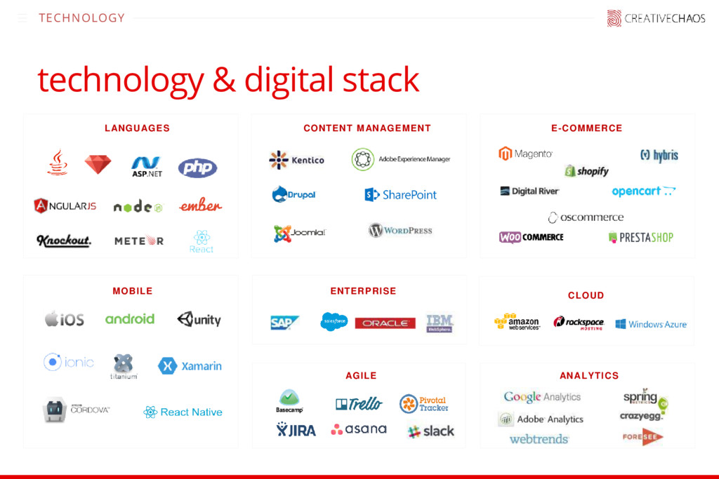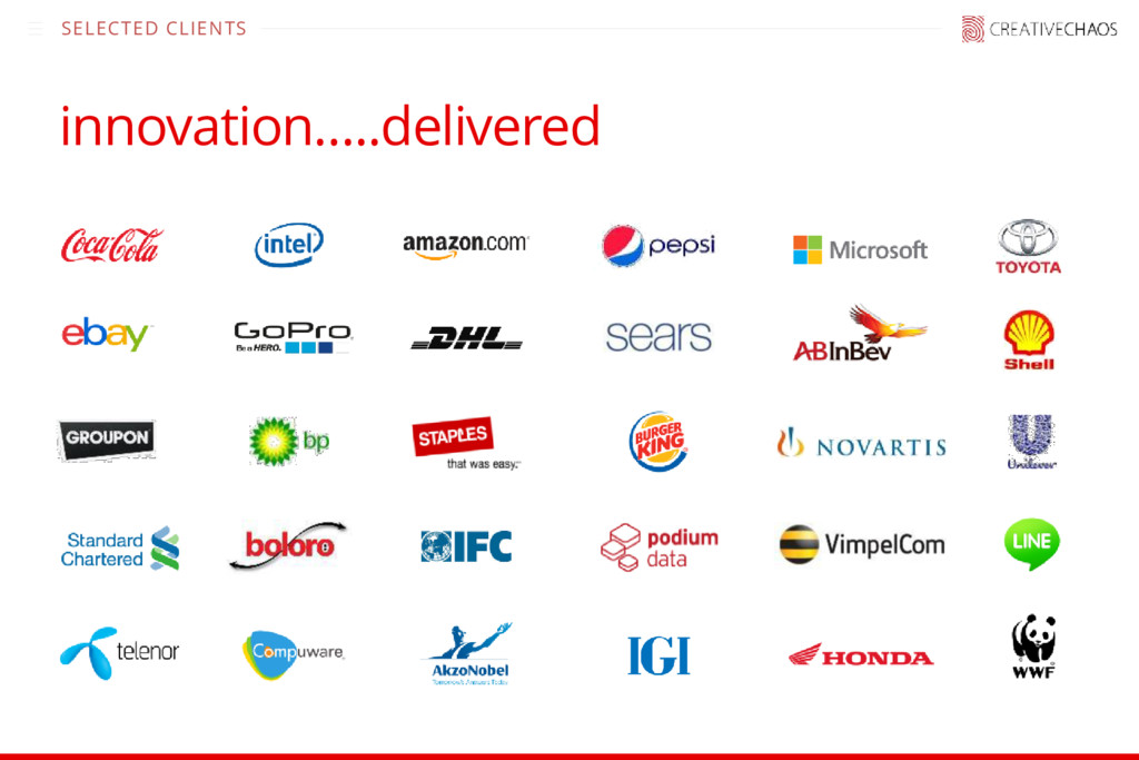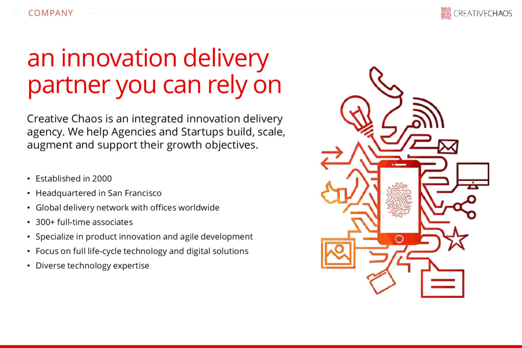 Chaos is an integrated innovation delivery agency. We help Agencies and Startups build, scale, augment and support their growth objectives. • Established in 2000 • Headquartered in San Francisco • Global delivery network with offices worldwide • 300+ full-time associates • Specialize in product innovation and agile development • Focus on full life-cycle technology and digital solutions • Diverse technology expertise