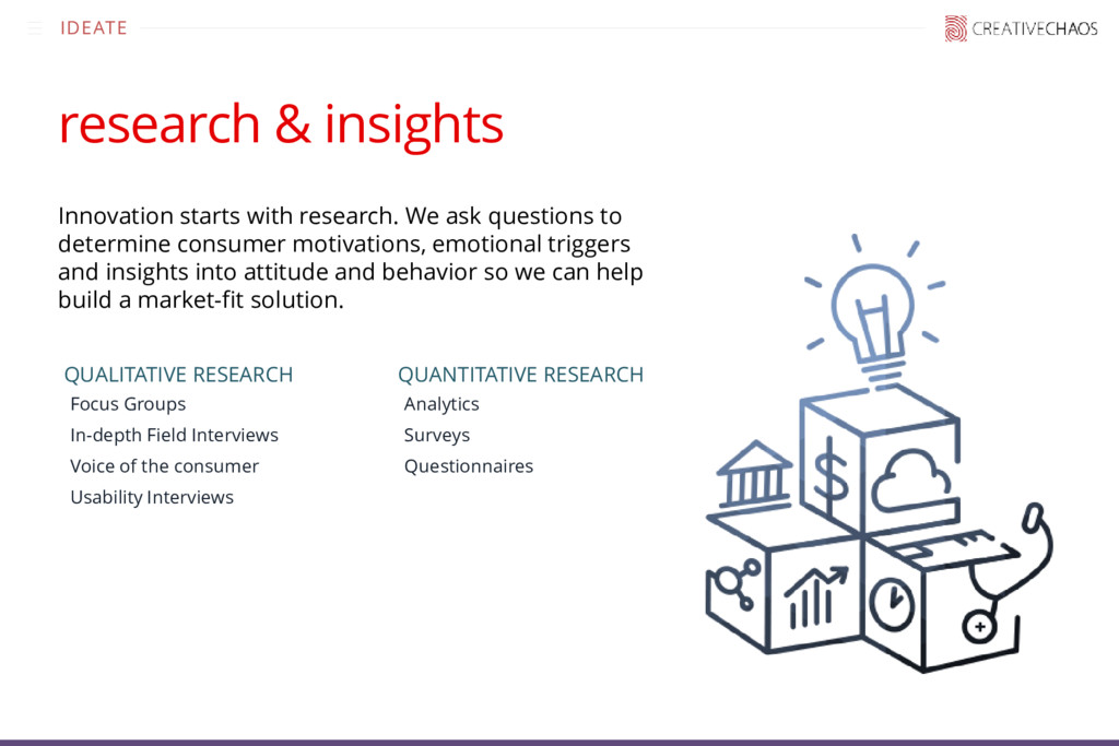 questions to determine consumer motivations, emotional triggers and insights into attitude and behavior so we can help build a market-fit solution. QUALITATIVE RESEARCH •Focus Groups •In-depth Field Interviews •Voice of the consumer •Usability Interviews QUANTITATIVE RESEARCH •Analytics •Surveys •Questionnaires