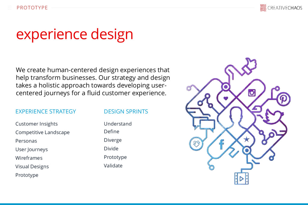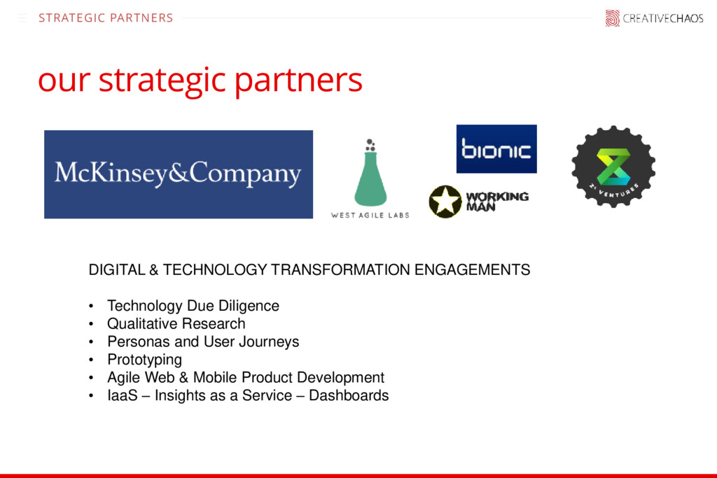 • Technology Due Diligence • Qualitative Research • Personas and User Journeys • Prototyping • Agile Web & Mobile Product Development • IaaS – Insights as a Service – Dashboards