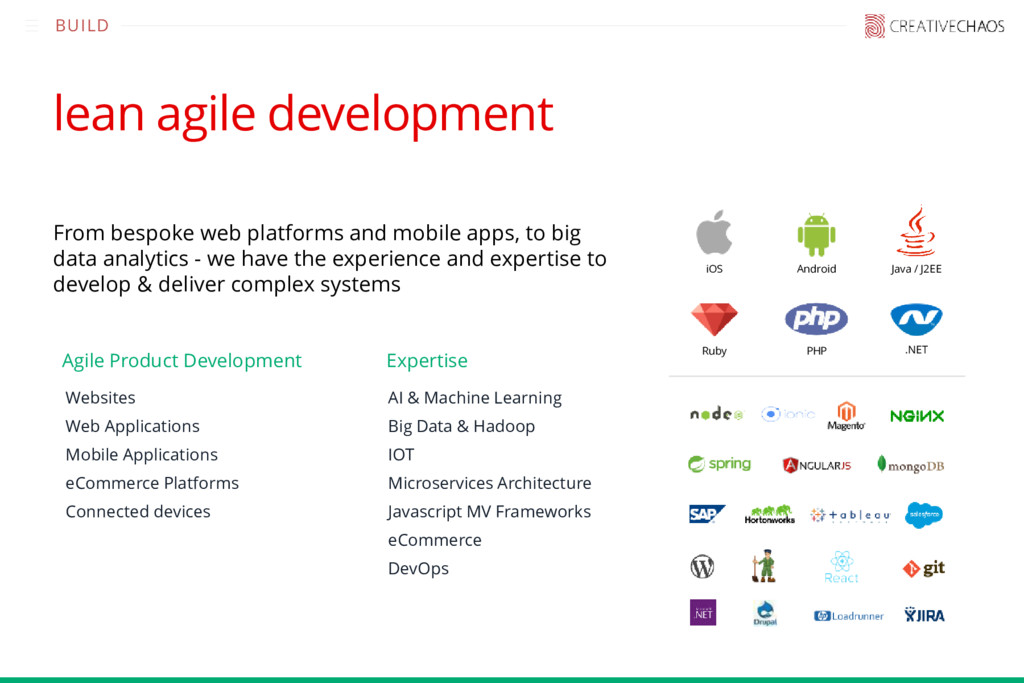 to big data analytics - we have the experience and expertise to develop & deliver complex systems iOS Android Java / J2EE Ruby .NET PHP Agile Product Development BUILD •Websites •Web Applications •Mobile Applications •eCommerce Platforms •Connected devices •AI & Machine Learning •Big Data & Hadoop •IOT •Microservices Architecture •Javascript MV Frameworks •eCommerce •DevOps Expertise