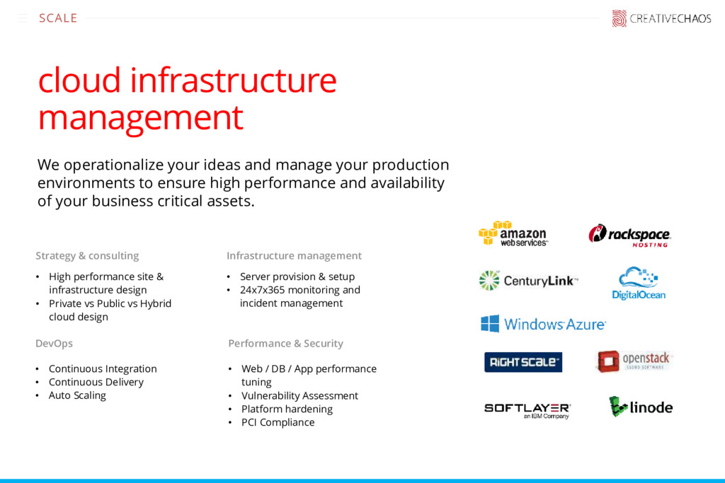 your production environments to ensure high performance and availability of your business critical assets. • Server provision & setup • 24x7x365 monitoring and incident management Infrastructure management • High performance site & infrastructure design • Private vs Public vs Hybrid cloud design Strategy & consulting • Web / DB / App performance tuning • Vulnerability Assessment • Platform hardening • PCI Compliance Performance & Security • Continuous Integration • Continuous Delivery • Auto Scaling DevOps