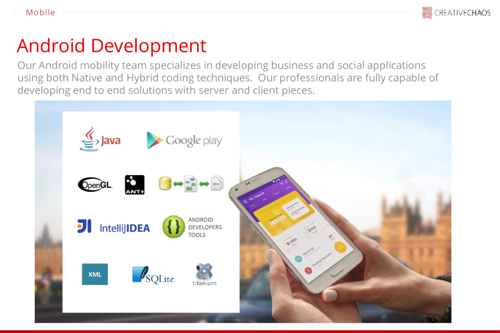 and social applications using both Native and Hybrid coding techniques. Our professionals are fully capable of developing end to end solutions with server and client pieces. Mobile ANDROID DEVELOPERS TOOLS XML