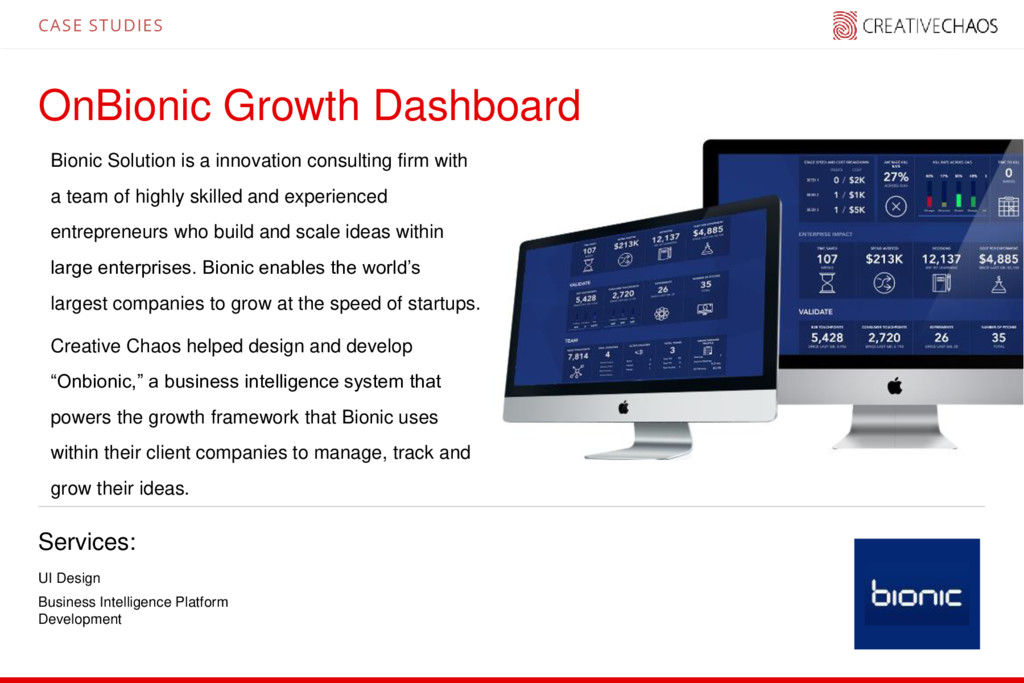 firm with a team of highly skilled and experienced entrepreneurs who build and scale ideas within large enterprises. Bionic enables the world’s largest companies to grow at the speed of startups. Creative Chaos helped design and develop “Onbionic,” a business intelligence system that powers the growth framework that Bionic uses within their client companies to manage, track and grow their ideas. UI Design Business Intelligence Platform Development CASE STUDIES