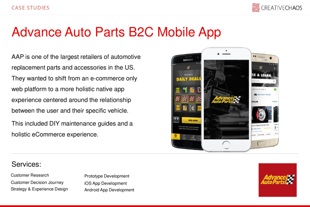 of the largest retailers of automotive replacement parts and accessories in the US. They wanted to shift from an e-commerce only web platform to a more holistic native app experience centered around the relationship between the user and their specific vehicle. This included DIY maintenance guides and a holistic eCommerce experience. Customer Research Customer Decision Journey Strategy & Experience Design CASE STUDIES Prototype Development iOS App Development Android App Development