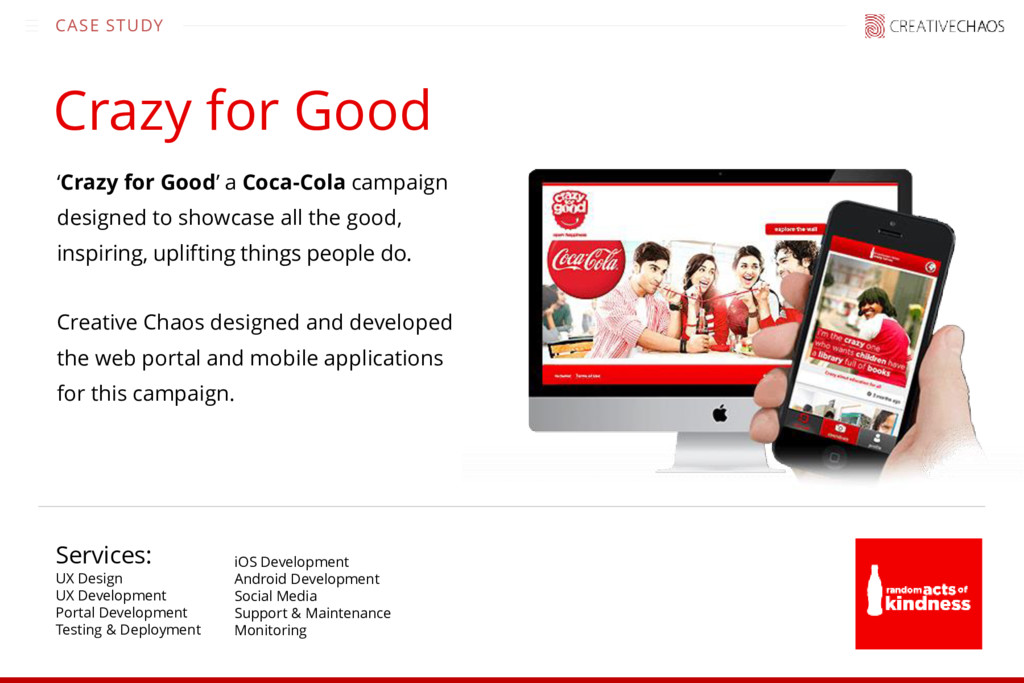 showcase all the good, inspiring, uplifting things people do. Creative Chaos designed and developed the web portal and mobile applications for this campaign. Crazy for Good Services: UX Design UX Development Portal Development Testing & Deployment iOS Development Android Development Social Media Support & Maintenance Monitoring
