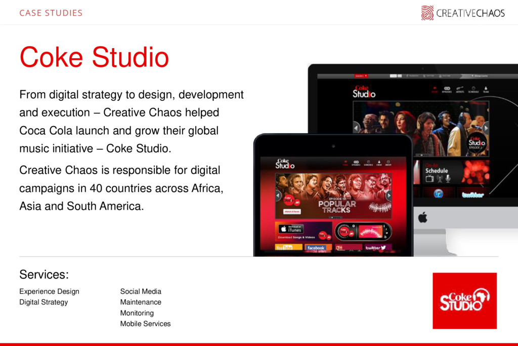 execution – Creative Chaos helped Coca Cola launch and grow their global music initiative – Coke Studio. Creative Chaos is responsible for digital campaigns in 40 countries across Africa, Asia and South America. Experience Design Digital Strategy CASE STUDIES Social Media Maintenance Monitoring Mobile Services