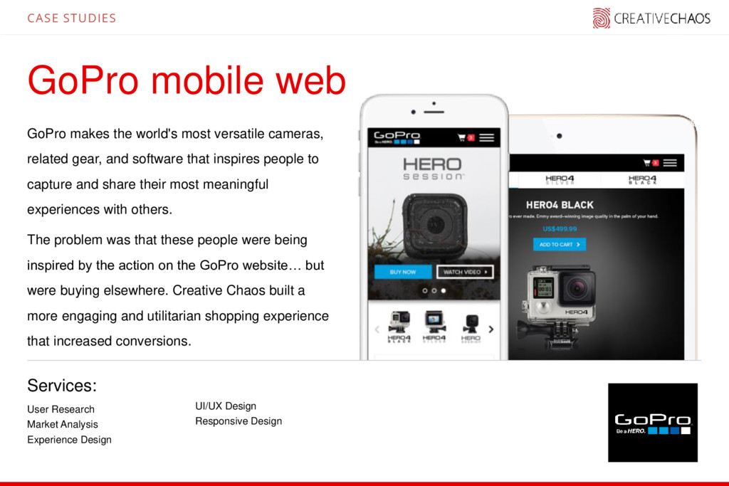 cameras, related gear, and software that inspires people to capture and share their most meaningful experiences with others. The problem was that these people were being inspired by the action on the GoPro website… but were buying elsewhere. Creative Chaos built a more engaging and utilitarian shopping experience that increased conversions. User Research Market Analysis Experience Design UI/UX Design Responsive Design CASE STUDIES