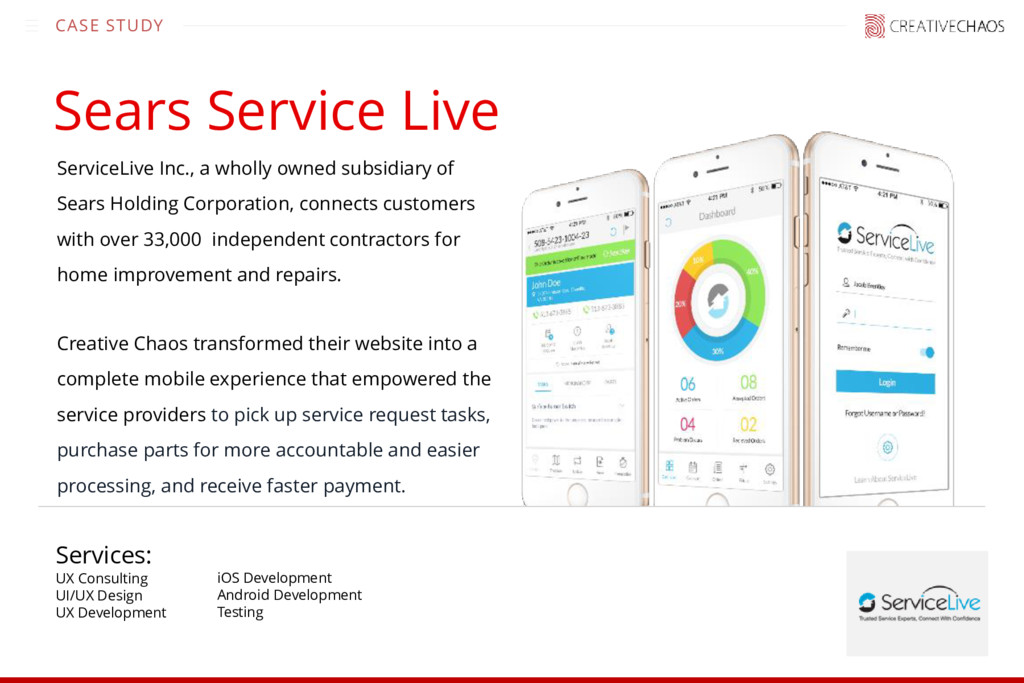 UX Development iOS Development Android Development Testing ServiceLive Inc., a wholly owned subsidiary of Sears Holding Corporation, connects customers with over 33,000 independent contractors for home improvement and repairs. Creative Chaos transformed their website into a complete mobile experience that empowered the service providers to pick up service request tasks, purchase parts for more accountable and easier processing, and receive faster payment.