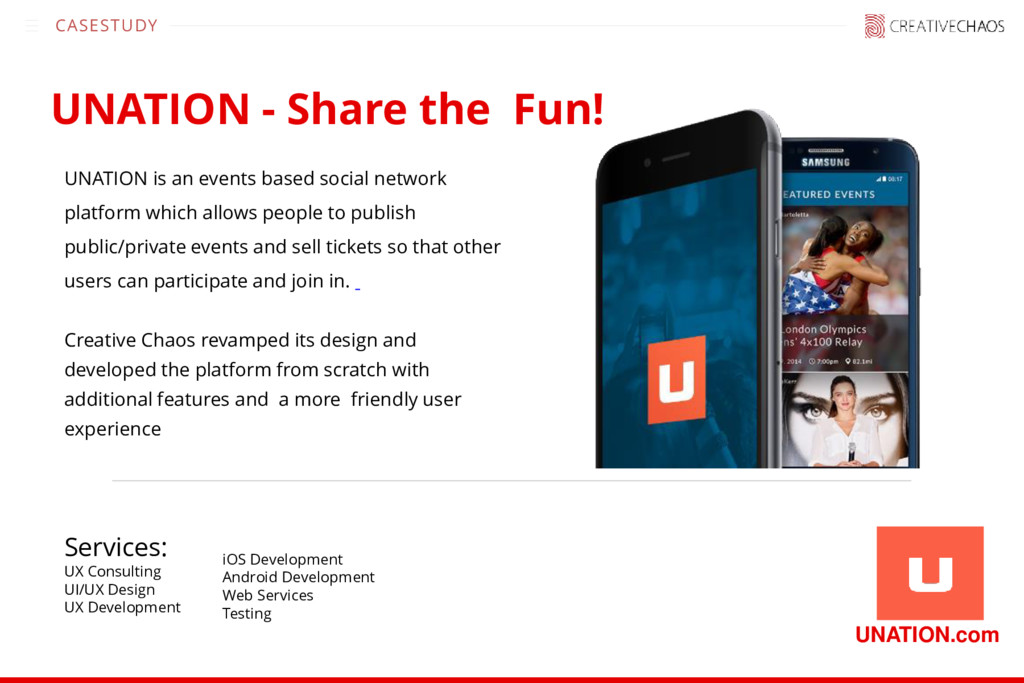 allows people to publish public/private events and sell tickets so that other users can participate and join in. Creative Chaos revamped its design and developed the platform from scratch with additional features and a more friendly user experience UNATION - Share the Fun! Services: UX Consulting UI/UX Design UX Development iOS Development Android Development Web Services Testing UNATION.com