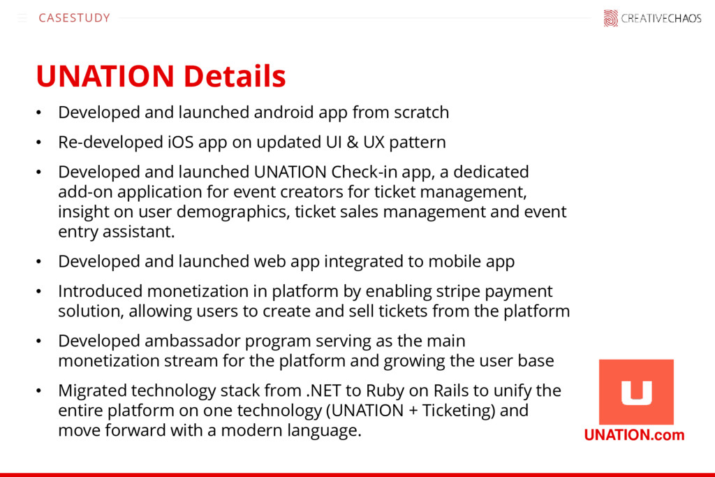 Re-developed iOS app on updated UI & UX pattern • Developed and launched UNATION Check-in app, a dedicated add-on application for event creators for ticket management, insight on user demographics, ticket sales management and event entry assistant. • Developed and launched web app integrated to mobile app • Introduced monetization in platform by enabling stripe payment solution, allowing users to create and sell tickets from the platform • Developed ambassador program serving as the main monetization stream for the platform and growing the user base • Migrated technology stack from .NET to Ruby on Rails to unify the entire platform on one technology (UNATION + Ticketing) and move forward with a modern language. UNATION.com UNATION Details