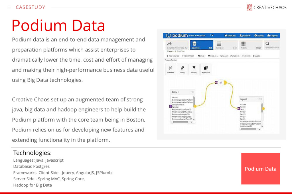 and preparation platforms which assist enterprises to dramatically lower the time, cost and effort of managing and making their high-performance business data useful using Big Data technologies. Creative Chaos set up an augmented team of strong java, big data and hadoop engineers to help build the Podium platform with the core team being in Boston. Podium relies on us for developing new features and extending functionality in the platform. Podium Data Technologies: Languages: Java, Javascript Database: Postgres Frameworks: Client Side - Jquery, AngularJS, JSPlumb; Server Side - Spring MVC, Spring Core, Hadoop for Big Data