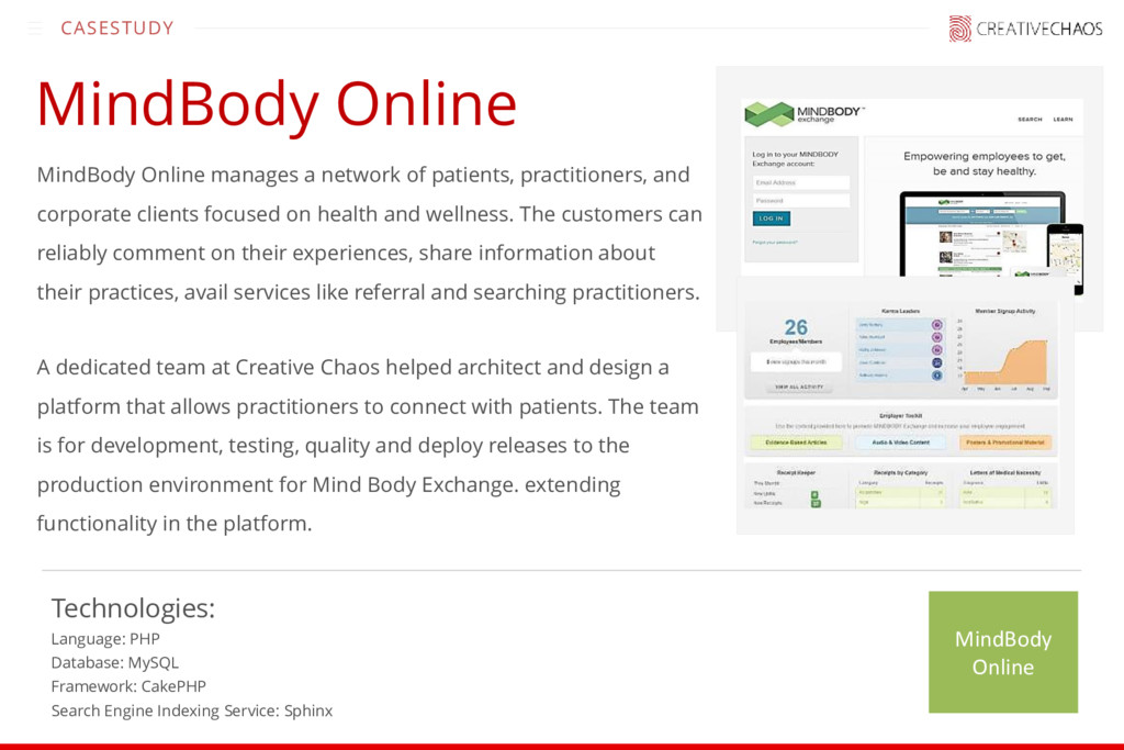 practitioners, and corporate clients focused on health and wellness. The customers can reliably comment on their experiences, share information about their practices, avail services like referral and searching practitioners. A dedicated team at Creative Chaos helped architect and design a platform that allows practitioners to connect with patients. The team is for development, testing, quality and deploy releases to the production environment for Mind Body Exchange. extending functionality in the platform. MindBody Online Technologies: Language: PHP Database: MySQL Framework: CakePHP Search Engine Indexing Service: Sphinx