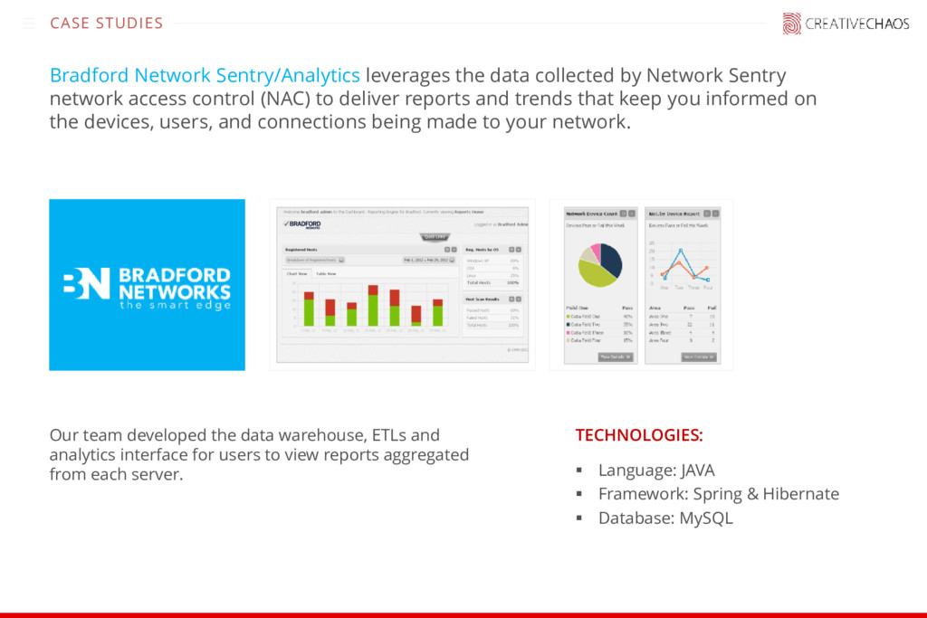 for users to view reports aggregated from each server. ▪ Language: JAVA ▪ Framework: Spring & Hibernate ▪ Database: MySQL TECHNOLOGIES: CASE STUDIES Bradford Network Sentry/Analytics leverages the data collected by Network Sentry network access control (NAC) to deliver reports and trends that keep you informed on the devices, users, and connections being made to your network.