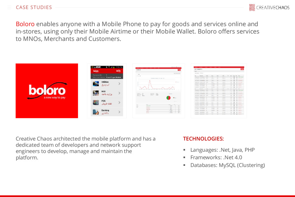 team of developers and network support engineers to develop, manage and maintain the platform. ▪ Languages: .Net, Java, PHP ▪ Frameworks: .Net 4.0 ▪ Databases: MySQL (Clustering) TECHNOLOGIES: CASE STUDIES Boloro enables anyone with a Mobile Phone to pay for goods and services online and in-stores, using only their Mobile Airtime or their Mobile Wallet. Boloro offers services to MNOs, Merchants and Customers.