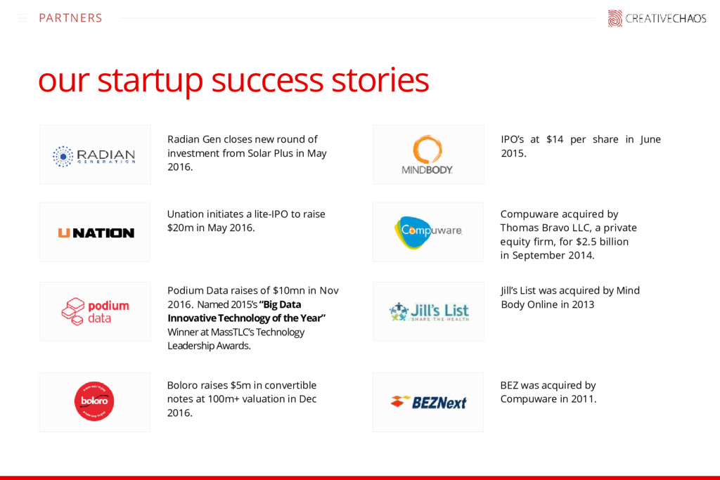 of investment from Solar Plus in May 2016. Unation initiates a lite-IPO to raise $20m in May 2016. Podium Data raises of $10mn in Nov 2016. Named 2015’s “Big Data Innovative Technology of the Year” Winner at MassTLC’s Technology Leadership Awards. Boloro raises $5m in convertible notes at 100m+ valuation in Dec 2016. IPO’s at $14 per share in June 2015. Compuware acquired by Thomas Bravo LLC, a private equity firm, for $2.5 billion in September 2014. Jill’s List was acquired by Mind Body Online in 2013 BEZ was acquired by Compuware in 2011.
