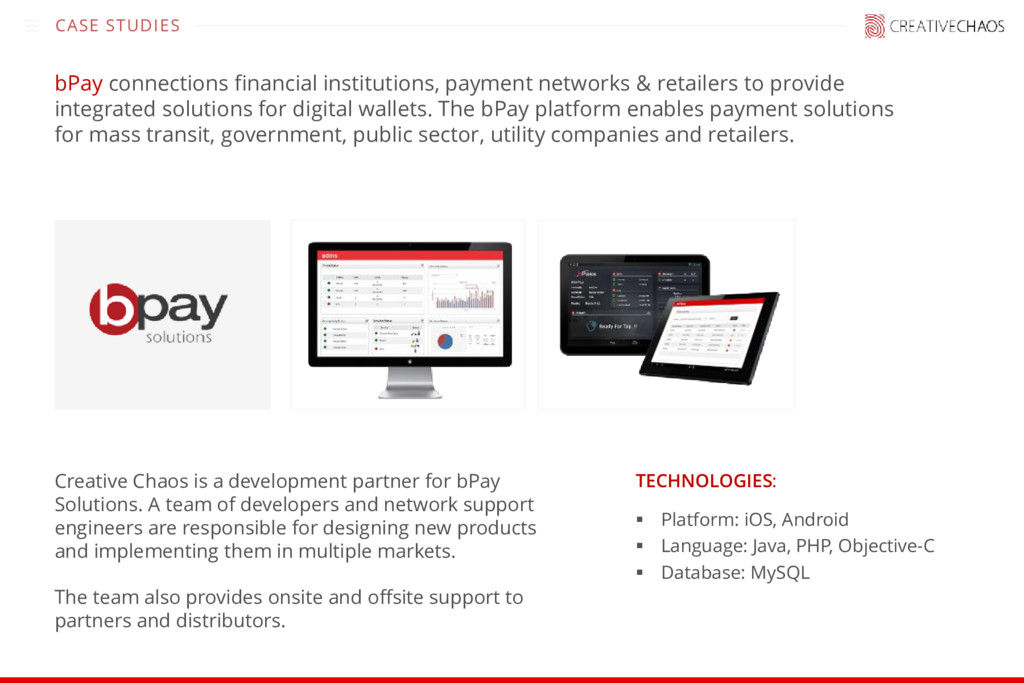 team of developers and network support engineers are responsible for designing new products and implementing them in multiple markets. The team also provides onsite and offsite support to partners and distributors. ▪ Platform: iOS, Android ▪ Language: Java, PHP, Objective-C ▪ Database: MySQL TECHNOLOGIES: CASE STUDIES bPay connections financial institutions, payment networks & retailers to provide integrated solutions for digital wallets. The bPay platform enables payment solutions for mass transit, government, public sector, utility companies and retailers.