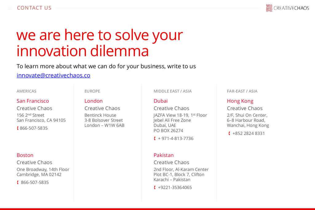 To learn more about what we can do for your business, write to us [email protected] AMERICAS San Francisco Creative Chaos 156 2nd Street San Francisco, CA 94105 866-507-5835 Boston Creative Chaos One Broadway, 14th Floor Cambridge, MA 02142 866-507-5835 MIDDLE EAST / ASIA Dubai Creative Chaos JAZFA View 18-19, 1st Floor Jebel Ali Free Zone Dubai, UAE PO BOX 26274 + 971-4-813-7736 Pakistan Creative Chaos 2nd Floor, Al-Karam Center Plot BC-1, Block 7, Clifton Karachi – Pakistan +9221-35364065 Hong Kong Creative Chaos 2/F, Shui On Center, 6–8 Harbour Road, Wanchai, Hong Kong +852 2824 8331 FAR-EAST / ASIA EUROPE London Creative Chaos Bentinck House 3-8 Bolsover Street London – W1W 6AB