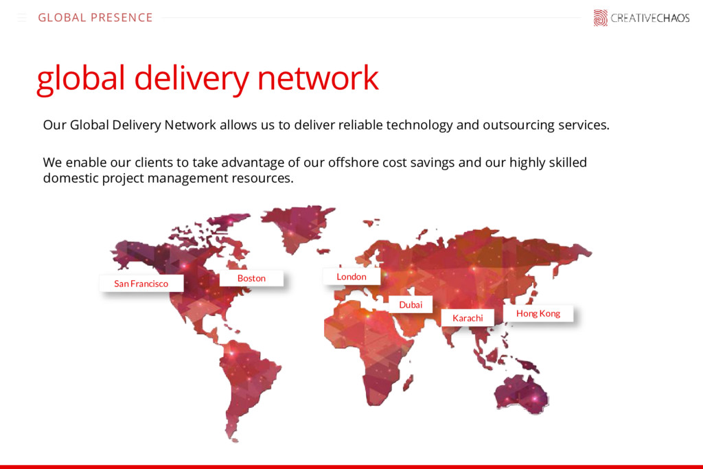 us to deliver reliable technology and outsourcing services. We enable our clients to take advantage of our offshore cost savings and our highly skilled domestic project management resources. San Francisco Boston London Dubai Karachi Hong Kong