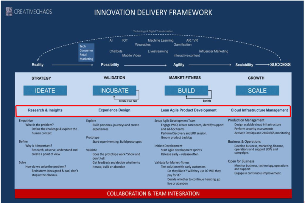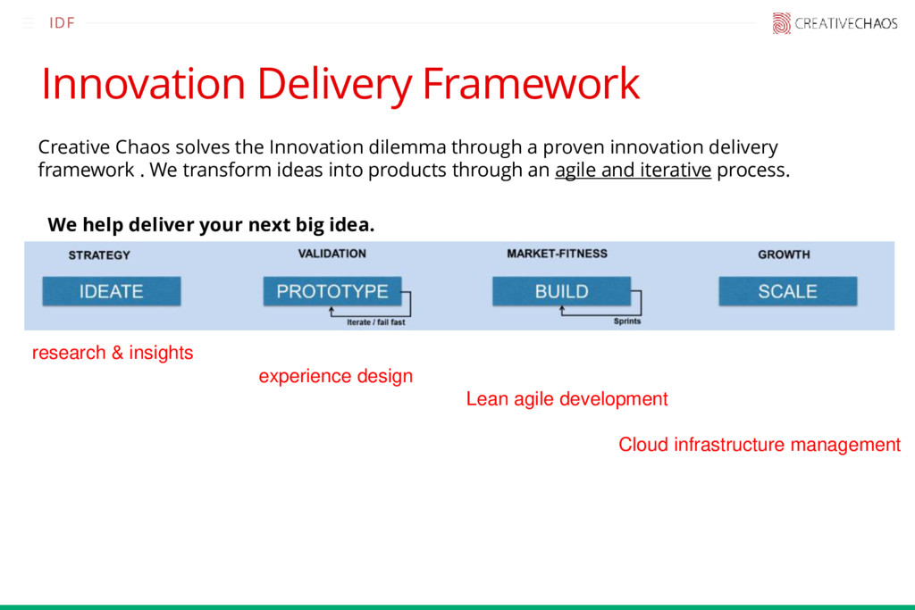 a proven innovation delivery framework . We transform ideas into products through an agile and iterative process. We help deliver your next big idea. IDF research & insights experience design Lean agile development Cloud infrastructure management