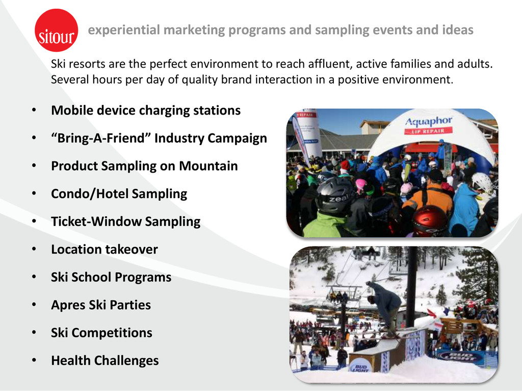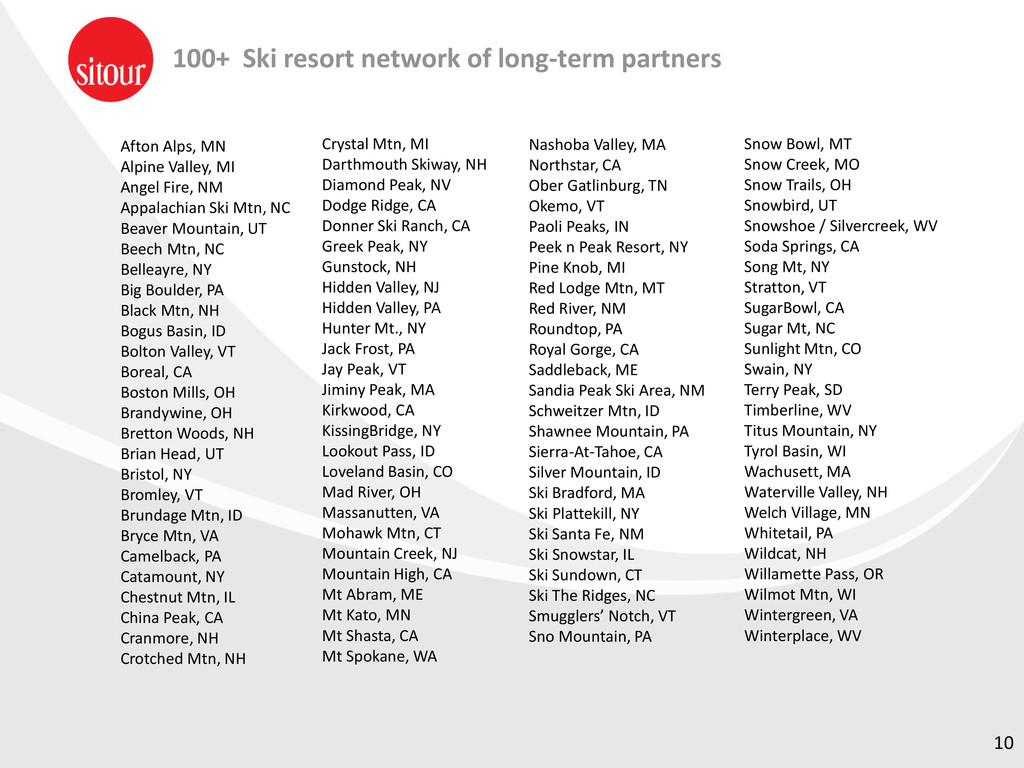 Alpine Valley, MI Angel Fire, NM Appalachian Ski Mtn, NC Beaver Mountain, UT Beech Mtn, NC Belleayre, NY Big Boulder, PA Black Mtn, NH Bogus Basin, ID Bolton Valley, VT Boreal, CA Boston Mills, OH Brandywine, OH Bretton Woods, NH Brian Head, UT Bristol, NY Bromley, VT Brundage Mtn, ID Bryce Mtn, VA Camelback, PA Catamount, NY Chestnut Mtn, IL China Peak, CA Cranmore, NH Crotched Mtn, NH Crystal Mtn, MI Darthmouth Skiway, NH Diamond Peak, NV Dodge Ridge, CA Donner Ski Ranch, CA Greek Peak, NY Gunstock, NH Hidden Valley, NJ Hidden Valley, PA Hunter Mt., NY Jack Frost, PA Jay Peak, VT Jiminy Peak, MA Kirkwood, CA KissingBridge, NY Lookout Pass, ID Loveland Basin, CO Mad River, OH Massanutten, VA Mohawk Mtn, CT Mountain Creek, NJ Mountain High, CA Mt Abram, ME Mt Kato, MN Mt Shasta, CA Mt Spokane, WA Nashoba Valley, MA Northstar, CA Ober Gatlinburg, TN Okemo, VT Paoli Peaks, IN Peek n Peak Resort, NY Pine Knob, MI Red Lodge Mtn, MT Red River, NM Roundtop, PA Royal Gorge, CA Saddleback, ME Sandia Peak Ski Area, NM Schweitzer Mtn, ID Shawnee Mountain, PA Sierra-At-Tahoe, CA Silver Mountain, ID Ski Bradford, MA Ski Plattekill, NY Ski Santa Fe, NM Ski Snowstar, IL Ski Sundown, CT Ski The Ridges, NC Smugglers’ Notch, VT Sno Mountain, PA Snow Bowl, MT Snow Creek, MO Snow Trails, OH Snowbird, UT Snowshoe / Silvercreek, WV Soda Springs, CA Song Mt, NY Stratton, VT SugarBowl, CA Sugar Mt, NC Sunlight Mtn, CO Swain, NY Terry Peak, SD Timberline, WV Titus Mountain, NY Tyrol Basin, WI Wachusett, MA Waterville Valley, NH Welch Village, MN Whitetail, PA Wildcat, NH Willamette Pass, OR Wilmot Mtn, WI Wintergreen, VA Winterplace, WV 10