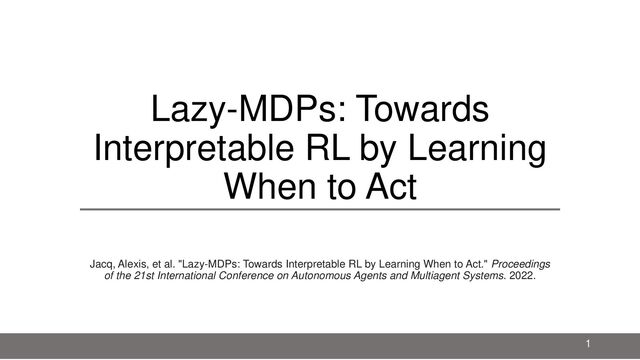 Jacq, Alexis, et al. "Lazy-MDPs: Towards Interpretable RL by Learning When to Act." Proceedings of the 21st International Conference on Autonomous Agents and Multiagent Systems. 2022.