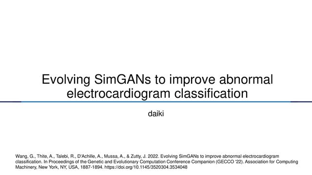 A., Talebi, R., D'Achille, A., Mussa, A., & Zutty, J. 2022. Evolving SimGANs to improve abnormal electrocardiogram classification. In Proceedings of the Genetic and Evolutionary Computation Conference Companion (GECCO '22). Association for Computing Machinery, New York, NY, USA, 1887-1894. https://doi.org/10.1145/3520304.3534048 daiki
