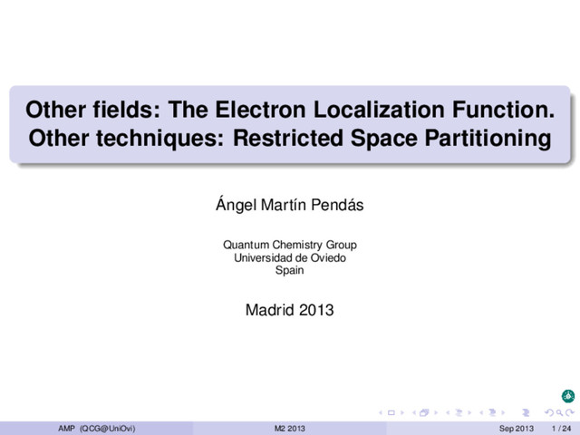 Physics 1990, 92, 5397-5403. A. Savin, A.D. Becke, J. Flad, R. Nesper, H. Preuss, G. von Schnering. Angewandte Chemie-International Edition in English 1991, 30, 409-412. B Silvi, A. Savin. Nature 1994, 371, 683. R. F. W. Bader, S. Johnson, T. H. Tang, P. L. A. Popelier Journal of Physical Chemistry 1996, 100, 15398-15415. M. Kohout, A. Savin, International Journal of Quantum Chemistry 1996, 60, 875-882. M. Kohout. International Journal of Quantum Chemistry 2004, 97, 651-658. M. Kohout, K. Pernal, F. R. Wagner, Y. Grin, Theoretical Chemistry Accounts 2004, 112, 453-459. A. Ormeci, H. Rosner F. R. Wagner M. Kohout, Y Grin, Journal of Physical Chemistry A 2006, 110, 1100-1105. AMP (QCG@UniOvi) M2 2013 Sep 2013 24 / 24