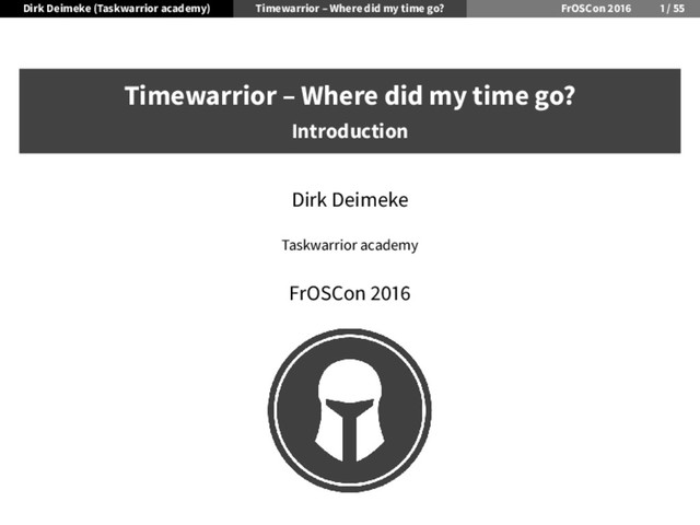 go? FrOSCon / Corrections ( ) Now whether this report now accurately represents your day, or whether it is a fiction you need to report (no judgement here), Timewarrior supports it, but let’s stop - the example can’t take much more. We saw the stop command with a specific end time, the move, the lengthen, split, join, tag and untag commands and the :fill hint being used. There are also the shorten, cancel, and delete commands. See man timew for full details.