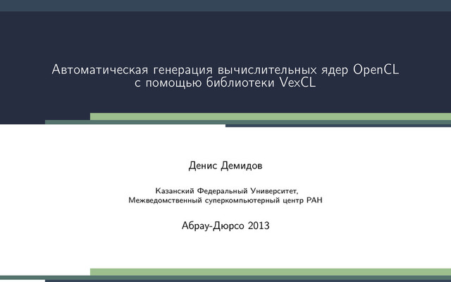 Рунге-Кутты. Будем вызывать ядро в цикле интегрирования. Получим 10-кратное ускорение! Потеряв универсальность odeint. 1 double3 lorenz_system(double r, double sigma, double b, double3 s) { 2 return (double3)( sigma ∗ (s.y − s.x), 3 r ∗ s.x − s.y − s.x ∗ s.z, 4 s.x ∗ s.y − b ∗ s.z); 5 } 6 kernel void lorenz_ensemble( 7 ulong n, double dt, double sigma, double b, 8 const global double ∗R, 9 global double ∗X, 10 global double ∗Y, 11 global double ∗Z 12 ) 13 { 14 for(size_t i = get_global_id(0); i < n; i += get_global_size(0)) { 15 double r = R[i]; 16 double3 s = (double3)(X[i], Y[i ], Z[i ]); 17 double3 k1, k2, k3, k4; 18 19 k1 = dt ∗ lorenz_system(r, sigma, b, s); 20 k2 = dt ∗ lorenz_system(r, sigma, b, s + 0.5 ∗ k1); 21 k3 = dt ∗ lorenz_system(r, sigma, b, s + 0.5 ∗ k2); 22 k4 = dt ∗ lorenz_system(r, sigma, b, s + k3); 23 24 s += (k1 + 2 ∗ k2 + 2 ∗ k3 + k4) / 6; 25 26 X[i] = s.x; Y[i] = s.y; Z[i ] = s.z; 27 } 28 }