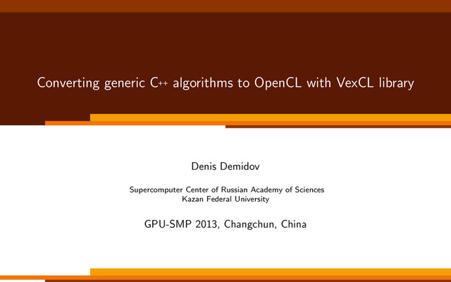 CUDA and OpenCL differ in their handling of compute kernels compilation. In NVIDIA’s framework the compute kernels are compiled to PTX code together with the host program. PTX is a pseudo-assembler language which is compiled at runtime for the specific NVIDIA device the kernel is launched on. Since PTX is already very low-level, this just-in-time kernel compilation has low overhead. In OpenCL the compute kernels are compiled at runtime from higher-level C-like sources, adding an overhead which is particularly noticeable for smaller sized problems. A portable pre-compilation to some low-level pseudo-code as in CUDA is not feasible in OpenCL because of hardware agnosticism by design. This distinction leads to higher initialization overheads of OpenCL programs, but at the same time it allows to generate better optimized kernels for the problem at hand. This possibility is explored in this work with help of the VexCL (https://github.com/ddemidov/vexcl) – an open source expression template library designed to ease C++ development of OpenCL applications.