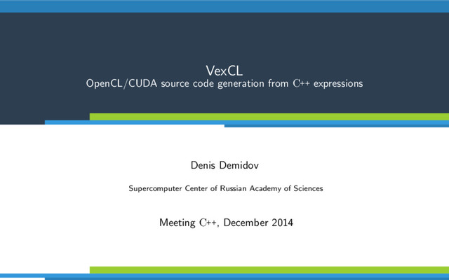 VexCL is an opensource C++ vector expression template library for OpenCL/CUDA. It has been created for ease of GPGPU development with C++ and provides convenient and intuitive notation for linear algebra operations, vector arithmetic and various parallel primitives. This talk discusses C++ techniques that VexCL uses to effectively generate OpenCL/CUDA compute kernels from user expressions.