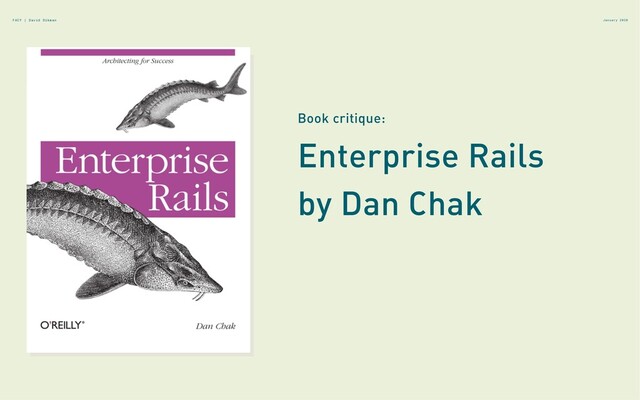 2020 DB FOCUS NOT EXHAUSTIVE LITTLE ARCHITECTURE Little detail on many concepts such as dependency injection or testing Almost each chapter touches on database concerns FACY | David Dikman
