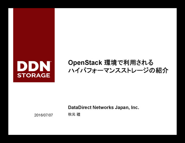 brands may be claimed as the property of others. Any statements or representations around future events are subject to change. OpenStack 環境で利用される ハイパフォーマンスストレージの紹介 2016/07/07 DataDirect Networks Japan, Inc. 秋元 禮