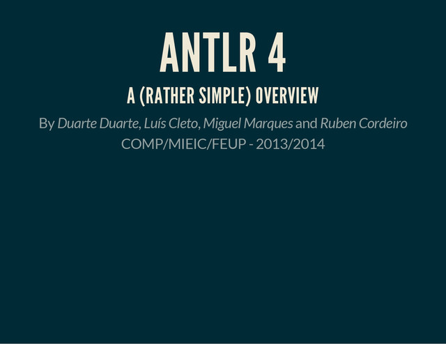 match an assignment; can match "f();" | ID '=' expr ';' // oops! an exact duplicate of previous alternative | expr ';' // expression statement ; expr: ID '(' ')' | INT ; ID : [a‐z]+ ; // match one or more of any lowercase letter INT : [0‐9]+ ; // match integers The ANTLR tool generates recursive-descent parsers from grammar rules such as the ones above.