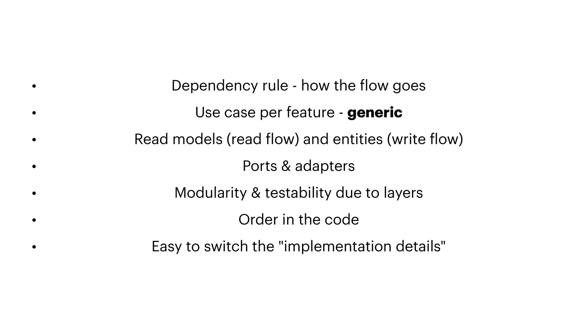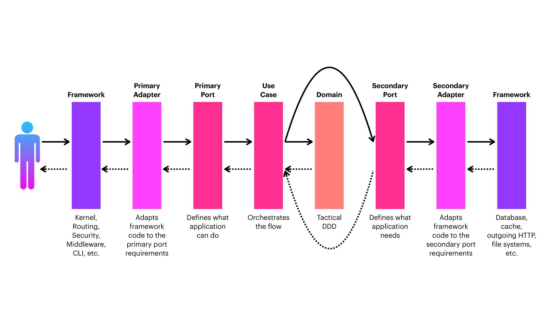 to the primary port requirements Primary Adapter De f ines what application can do Primary Port De f ines what application needs Secondary Port Tactical DDD Domain Adapts framework code to the secondary port requirements Secondary Adapter Database, cache, outgoing HTTP, f ile systems, etc. Framework Orchestrates the f low Use Case