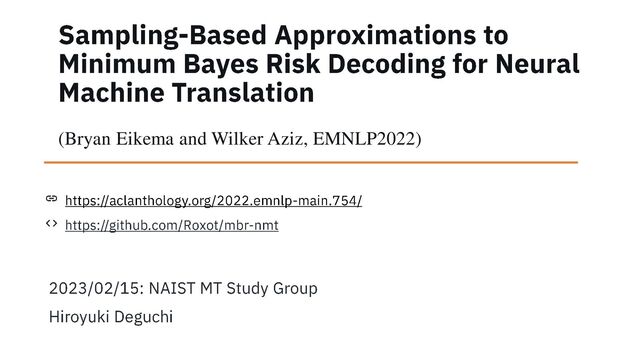 , … , 𝒚 𝑁 ⚫ ◼ 𝜇𝑢 𝒉; 𝒙, 𝜃 ⚫ ො 𝜇𝑢 𝒉; 𝒙, 𝑁 ≔ 1 𝑁 σ𝑛=1 𝑁 𝑢 𝒚 𝑛 , 𝒉 ⚫ 𝒚NbyN ≔ argmax𝒉∈ ഥ ℋ 𝒙 ො 𝜇𝑢 𝒉; 𝒙, 𝑁 ◼ ⚫ 𝑁2 ▶ ▶ 𝒪 𝑁2 × 𝑈 , 𝑈 is the uppperbound cost to assess the utility function once. ⚫ “Is MAP Decoding All You Need? The Inadequacy of the Mode in Neural Machine Translation”, Eikema&Aziz, COLING2020