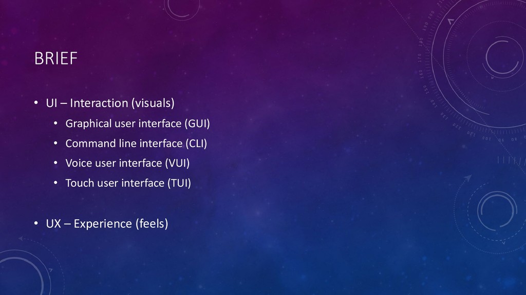 (GUI) • Command line interface (CLI) • Voice user interface (VUI) • Touch user interface (TUI) • UX – Experience (feels)