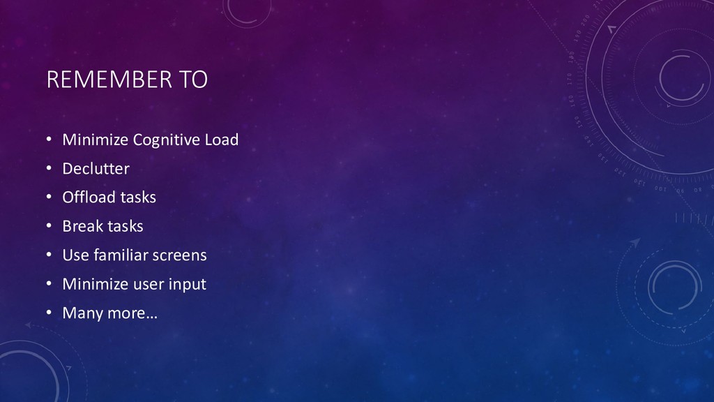 6. REMEMBER TO • Minimize Cognitive Load • Declutter • Offload