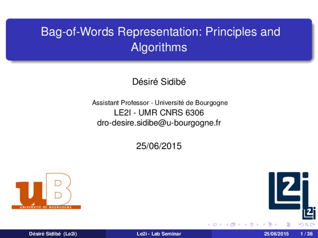 It is inspired by ideas from text/documents retrieval community Many extensions and improvements have been proposed Including spatial layout : spatial pyramid It falls within a more general framework Désiré Sidibé (Le2i) Le2i - Lab Seminar 25/06/2015 36 / 36