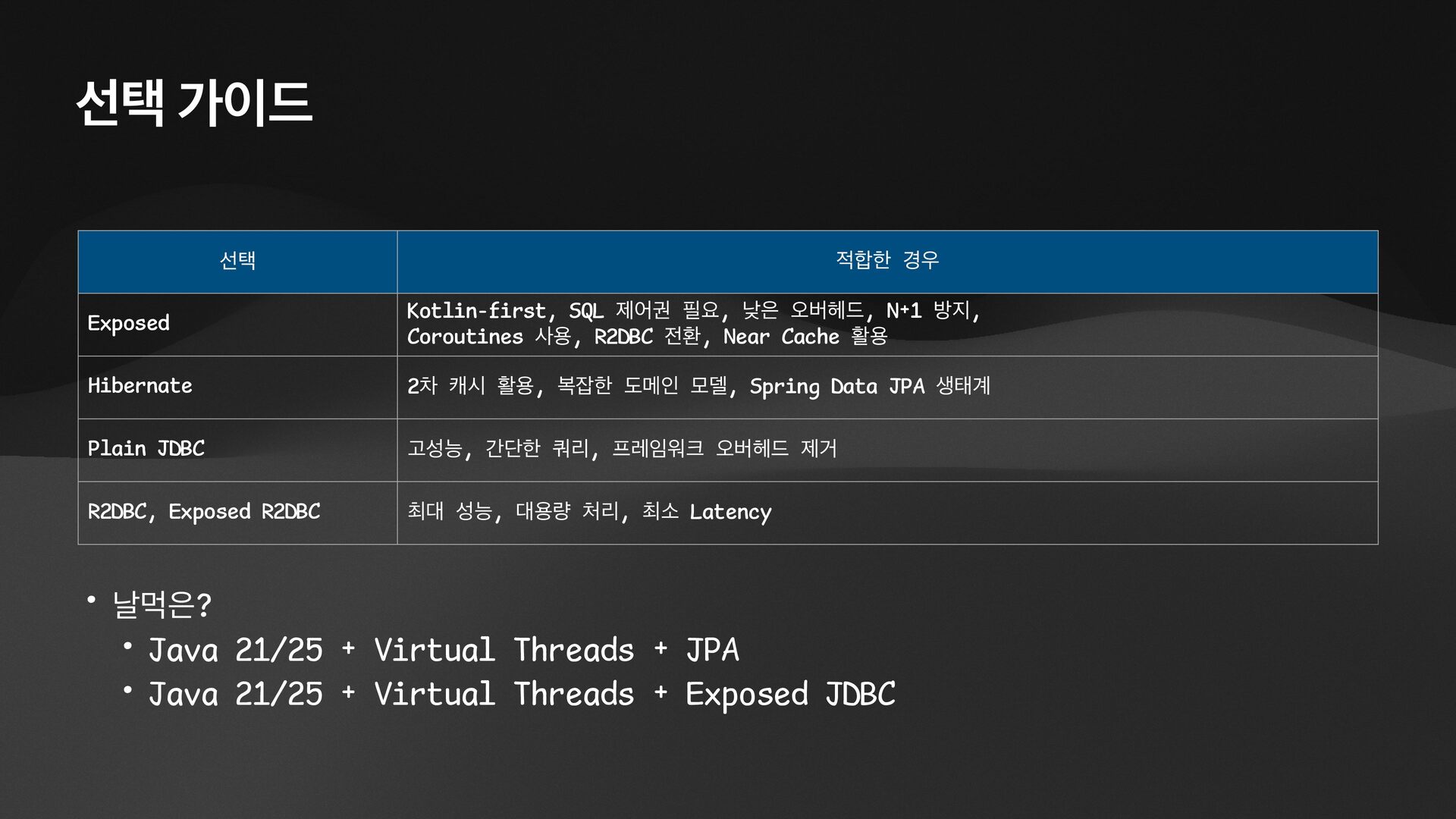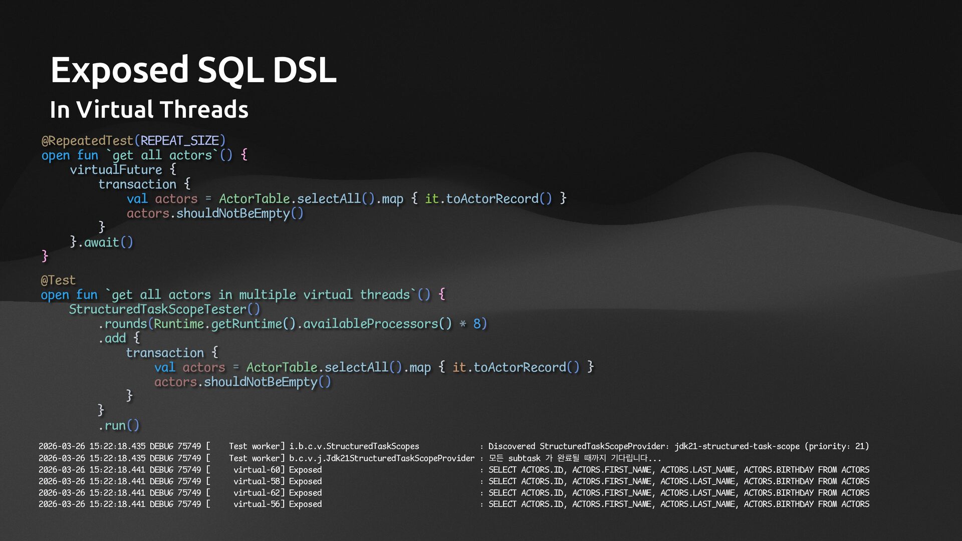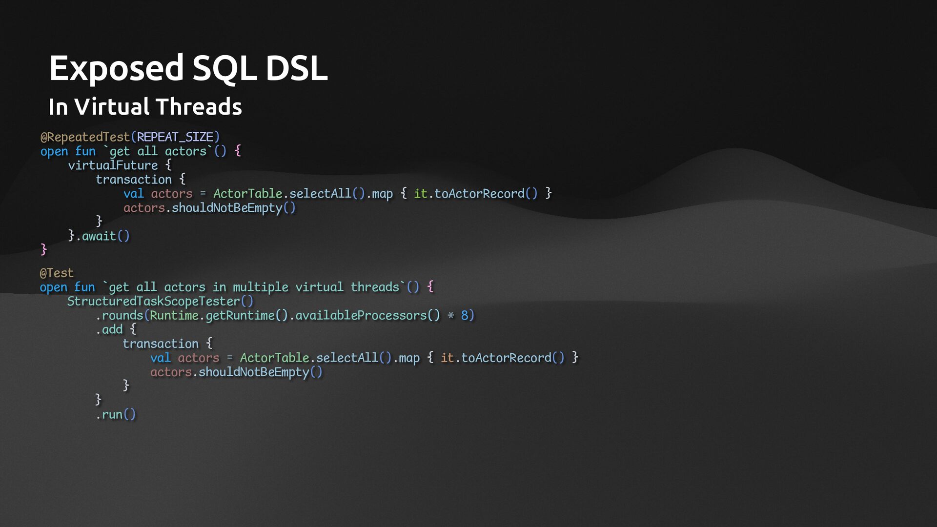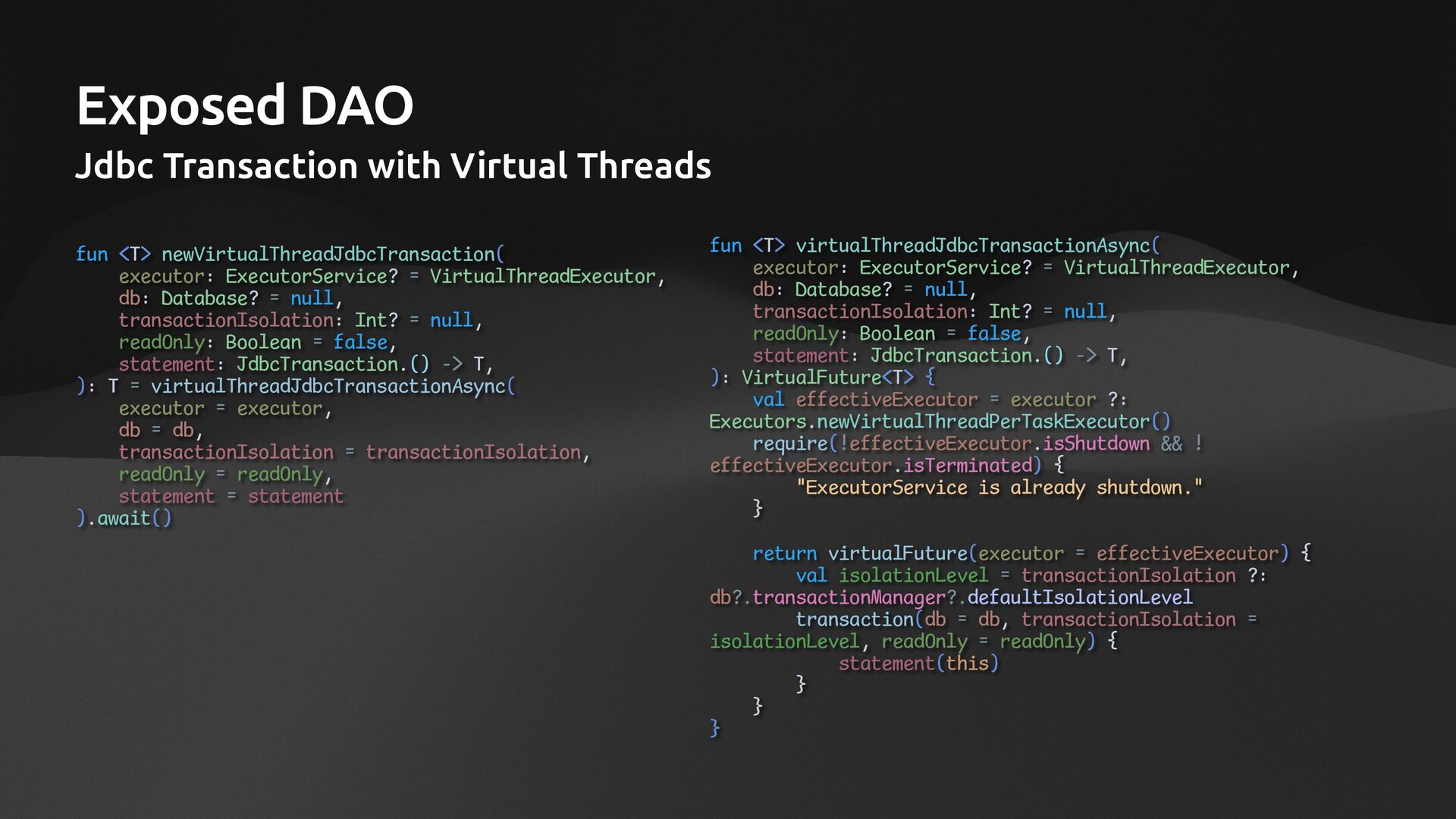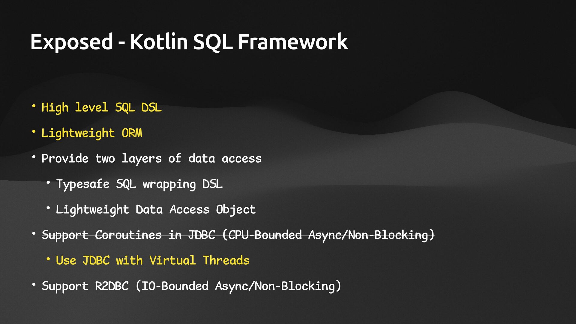 • Lightweight ORM • Provide two layers of data access • Typesafe SQL wrapping DSL • Lightweight Data Access Object • Support Coroutines in JDBC (CPU-Bounded Async/Non-Blocking) • Use JDBC with Virtual Threads • Support R2DBC (IO-Bounded Async/Non-Blocking)