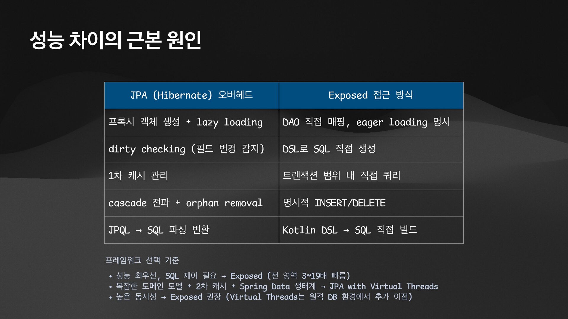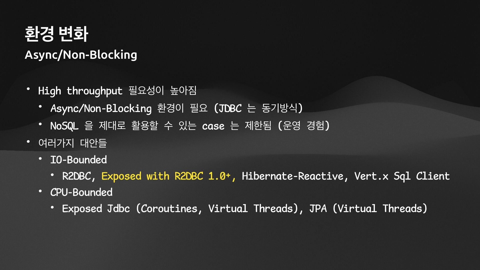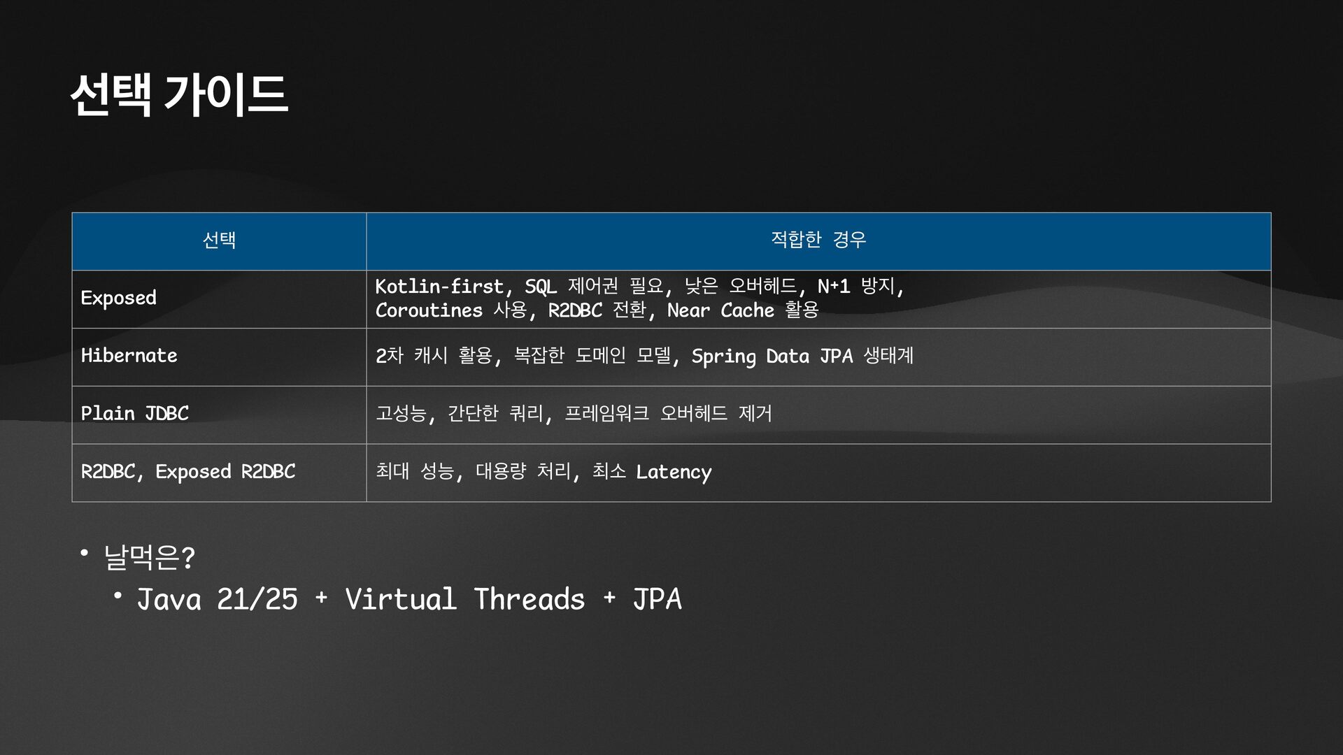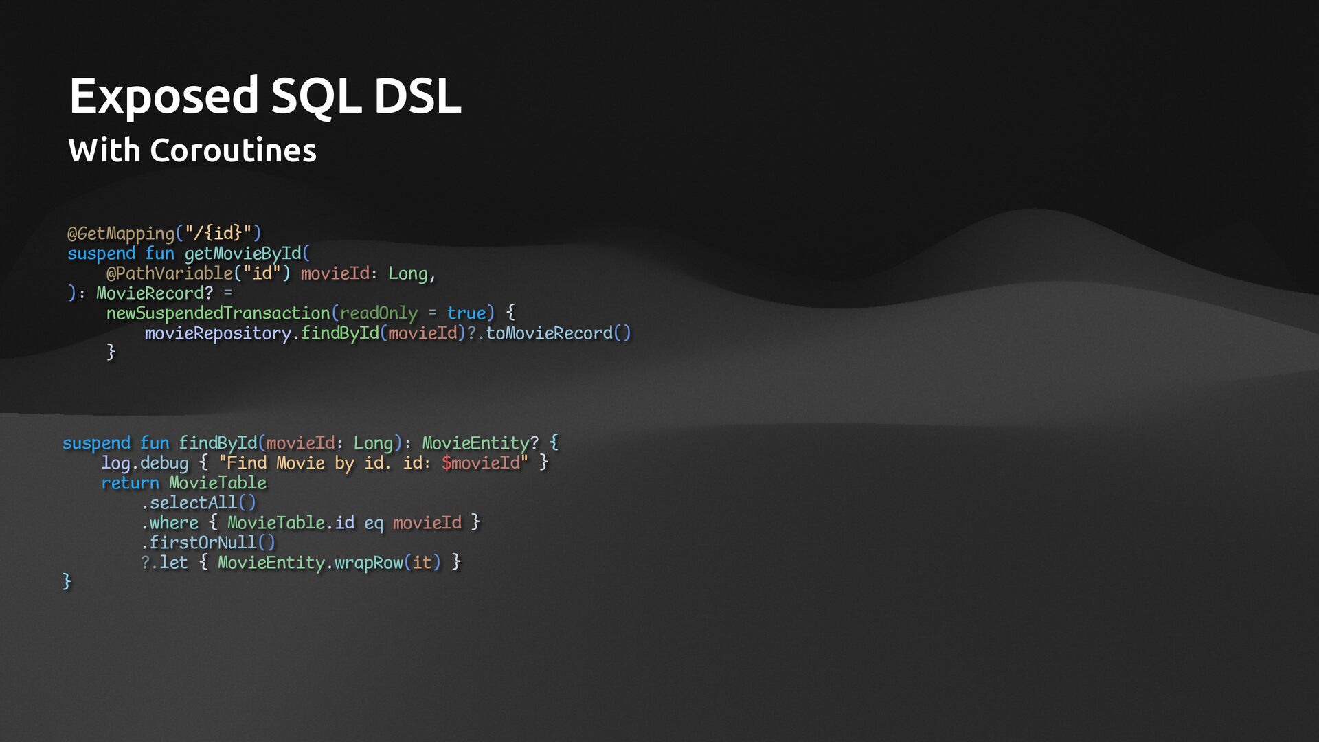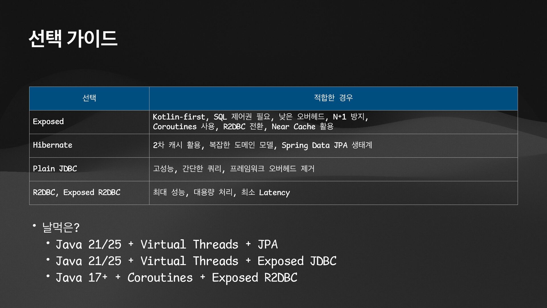 • Lightweight ORM • Provide two layers of data access • Typesafe SQL wrapping DSL • Lightweight Data Access Object • Support Coroutines in JDBC (CPU-Bounded Async/Non-Blocking) • Use JDBC with Virtual Threads • Support R2DBC (IO-Bounded Async/Non-Blocking)