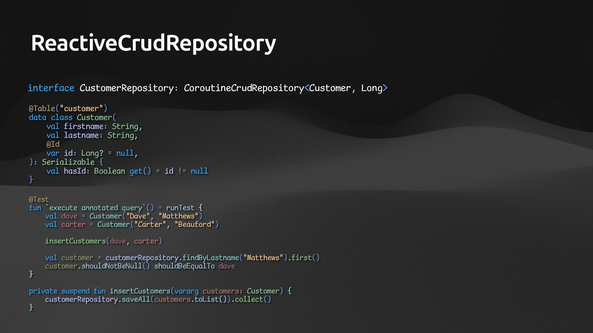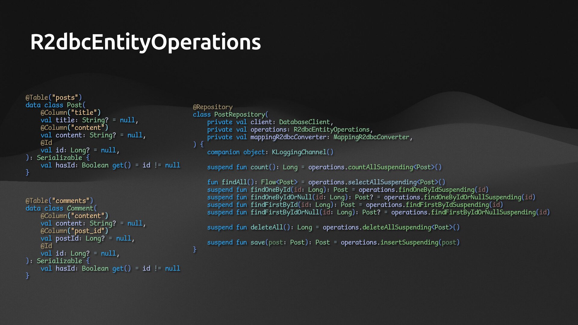 null, @Column("content") val content: String? = null, @Id val id: Long? = null, ): Serializable { val hasId: Boolean get() = id != null } @Table("comments") data class Comment( @Column("content") val content: String? = null, @Column("post_id") val postId: Long? = null, @Id val id: Long? = null, ): Serializable { val hasId: Boolean get() = id != null } @Repository class PostRepository( private val client: DatabaseClient, private val operations: R2dbcEntityOperations, private val mappingR2dbcConverter: MappingR2dbcConverter, ) { companion object: KLoggingChannel() suspend fun count(): Long = operations.countAllSuspending<Post>() fun findAll(): Flow<Post> = operations.selectAllSuspending<Post>() suspend fun findOneById(id: Long): Post = operations.findOneByIdSuspending(id) suspend fun findOneByIdOrNull(id: Long): Post? = operations.findOneByIdOrNullSuspending(id) suspend fun findFirstById(id: Long): Post = operations.findFirstByIdSuspending(id) suspend fun findFirstByIdOrNull(id: Long): Post? = operations.findFirstByIdOrNullSuspending(id) suspend fun deleteAll(): Long = operations.deleteAllSuspending<Post>() suspend fun save(post: Post): Post = operations.insertSuspending(post) }