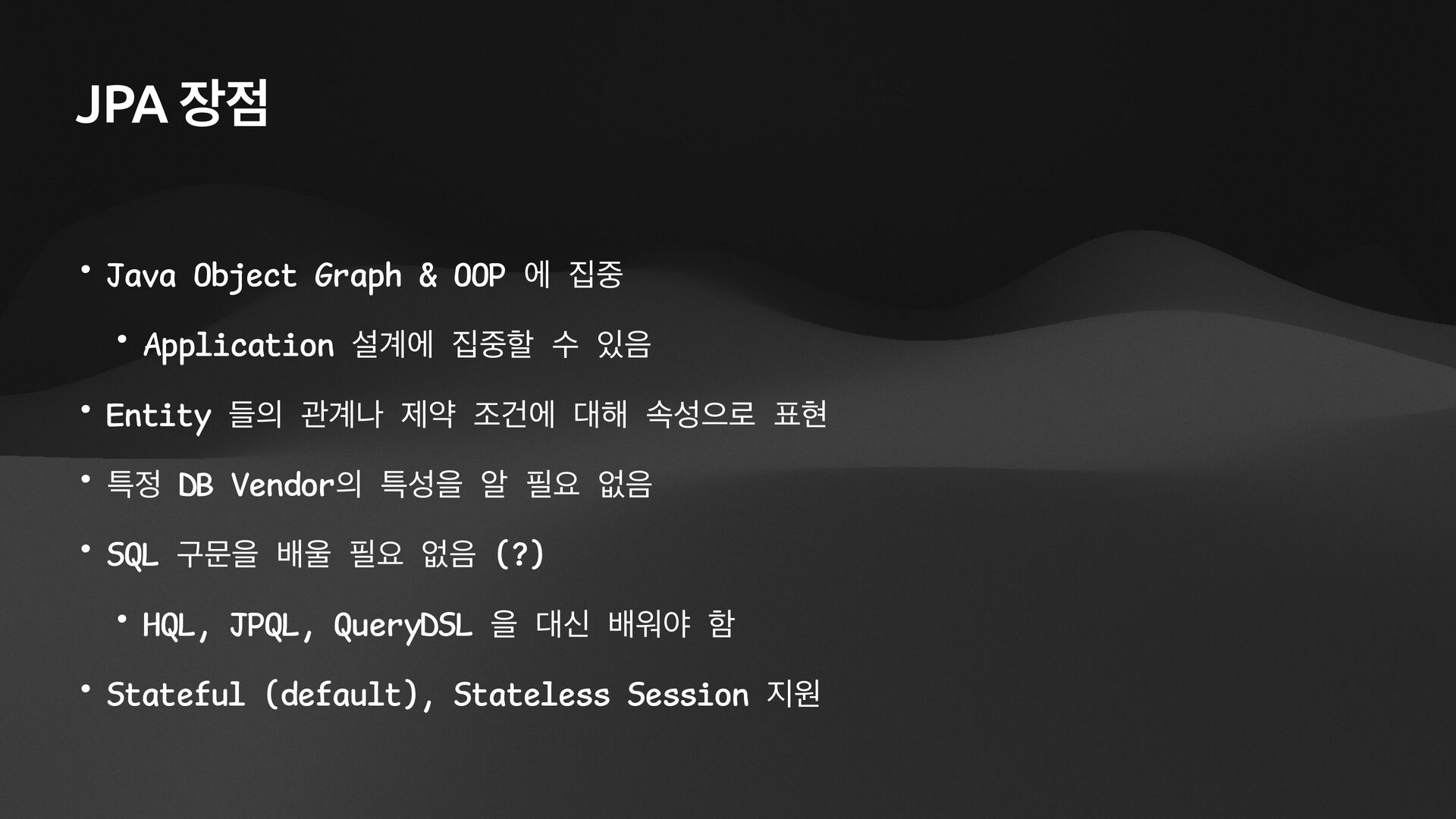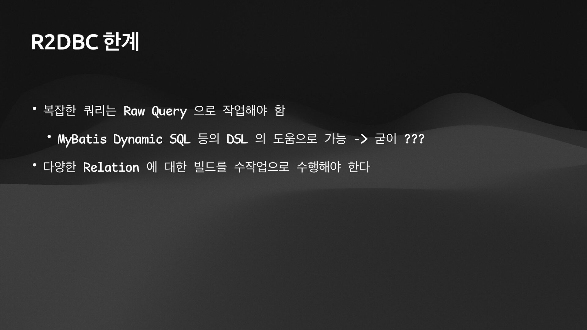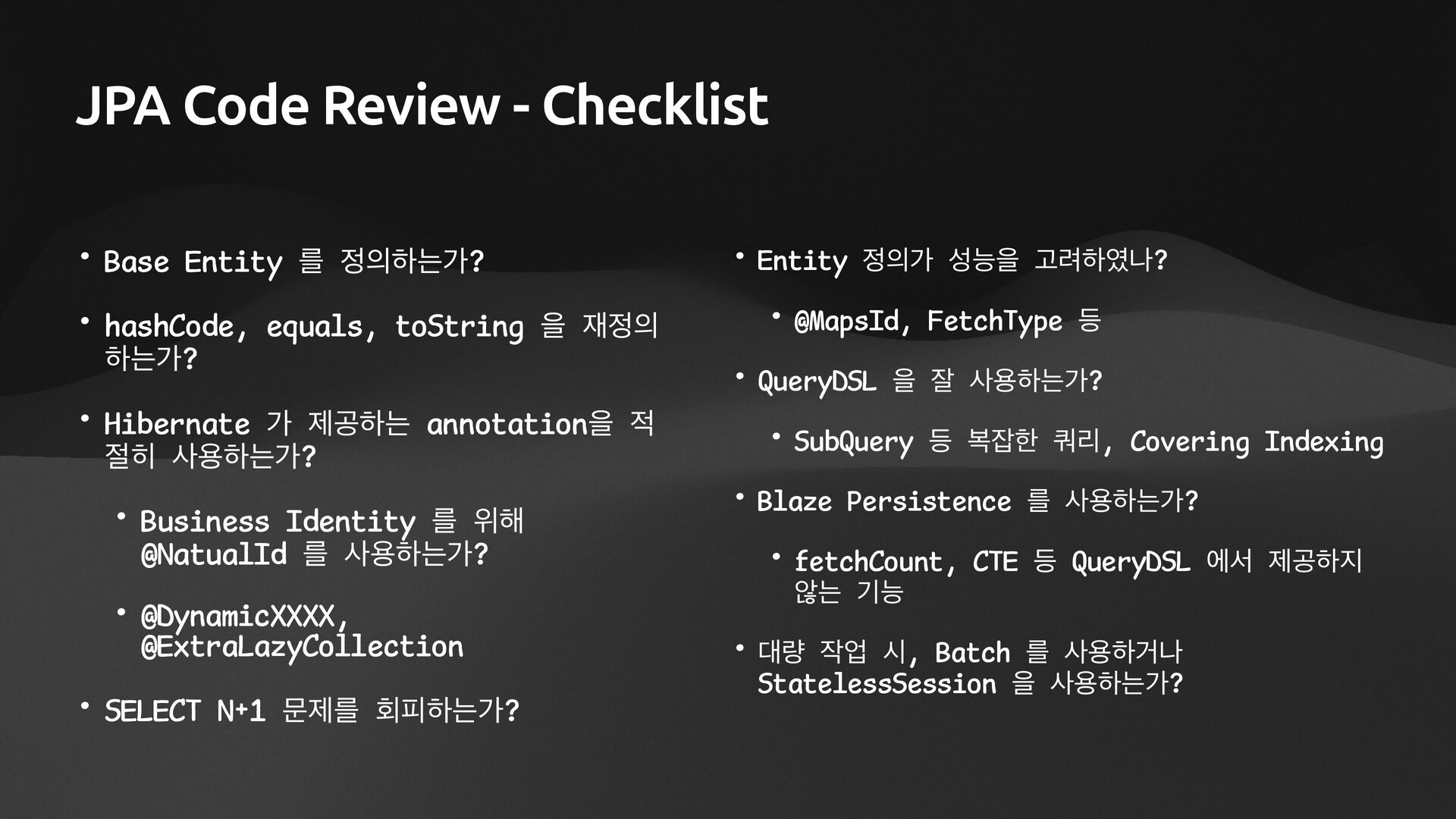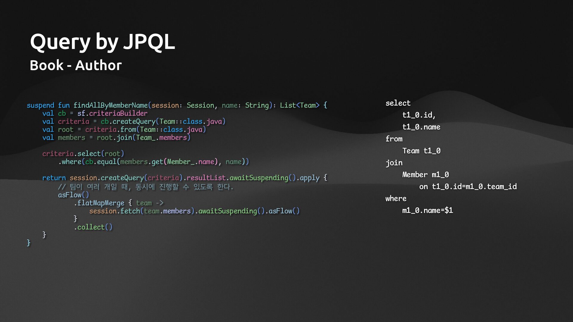 name: String): List<Team> { val cb = sf.criteriaBuilder val criteria = cb.createQuery(Team::class.java) val root = criteria.from(Team::class.java) val members = root.join(Team_.members) criteria.select(root) .where(cb.equal(members.get(Member_.name), name)) return session.createQuery(criteria).resultList.awaitSuspending().apply { // 팀이 여러 개일 때, 동시에 진행할 수 있도록 한다. asFlow() .flatMapMerge { team -> session.fetch(team.members).awaitSuspending().asFlow() } .collect() } } select t1_0.id, t1_0.name from Team t1_0 join Member m1_0 on t1_0.id=m1_0.team_id where m1_0.name=$1