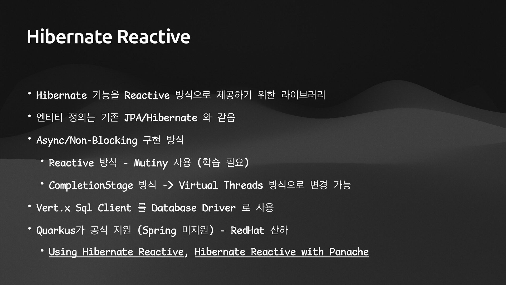 name: String): List<Team> { val cb = sf.criteriaBuilder val criteria = cb.createQuery(Team::class.java) val root = criteria.from(Team::class.java) val members = root.join(Team_.members) criteria.select(root) .where(cb.equal(members.get(Member_.name), name)) return session.createQuery(criteria).resultList.awaitSuspending().apply { // 팀이 여러 개일 때, 동시에 진행할 수 있도록 한다. asFlow() .flatMapMerge { team -> session.fetch(team.members).awaitSuspending().asFlow() } .collect() } }