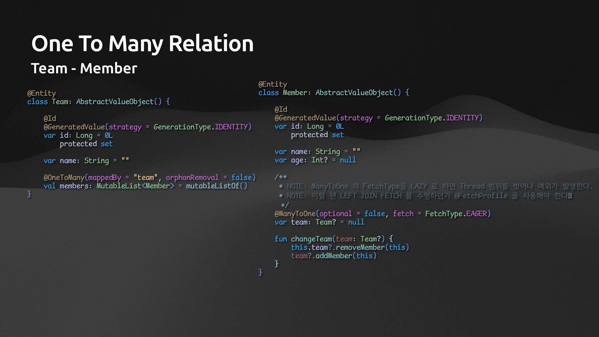 AbstractValueObject() { @Id @GeneratedValue(strategy = GenerationType.IDENTITY) var id: Long = 0L protected set var name: String = "" @OneToMany(mappedBy = "team", orphanRemoval = false) val members: MutableList<Member> = mutableListOf() } @Entity class Member: AbstractValueObject() { @Id @GeneratedValue(strategy = GenerationType.IDENTITY) var id: Long = 0L protected set var name: String = "" var age: Int? = null /** * NOTE: ManyToOne 의 FetchType을 LAZY 로 하면 Thread 범위를 벗어나 예외가 발생한다. * NOTE: 이럴 땐 LEFT JOIN FETCH 를 수행하던가 @FetchProfile 을 사용해야 한다 */ @ManyToOne(optional = false, fetch = FetchType.EAGER) var team: Team? = null fun changeTeam(team: Team?) { this.team?.removeMember(this) team?.addMember(this) } }